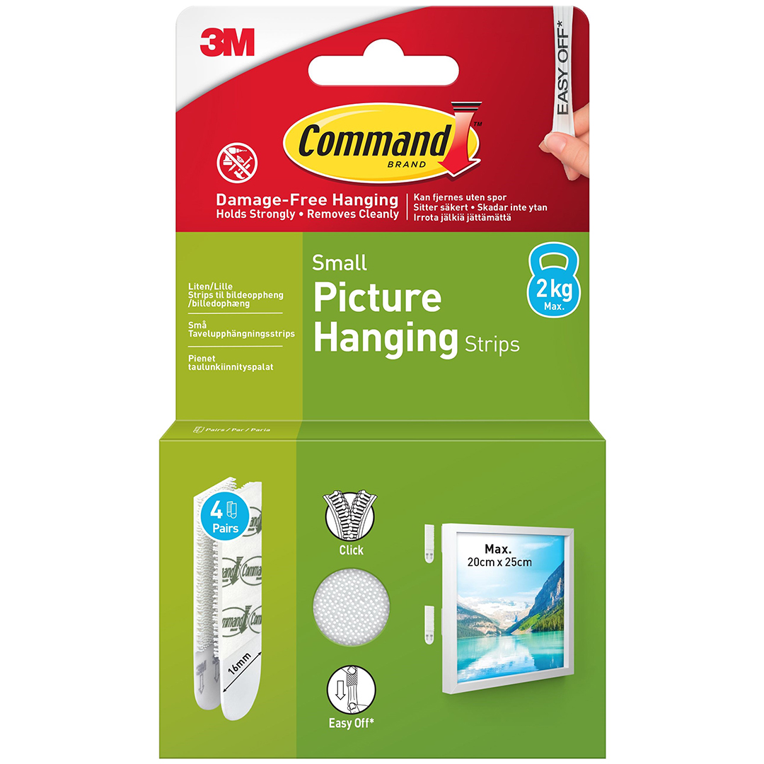 Die Verpackung enthält 4 Sätze schmale, weiße Strips. Trägt einen Rahmen von bis zu 2 kg und mit Abmessungen bis 20 x 25 cm.