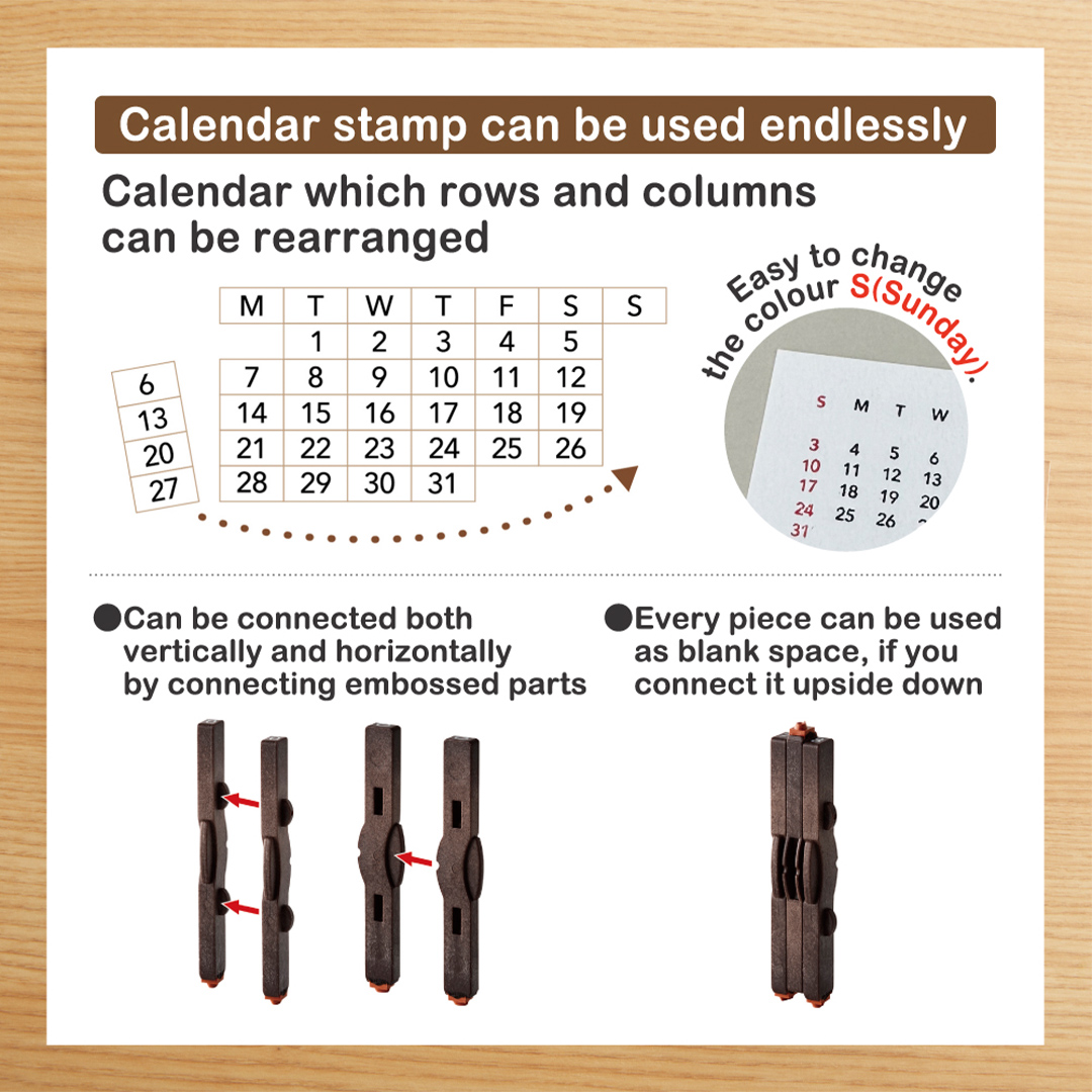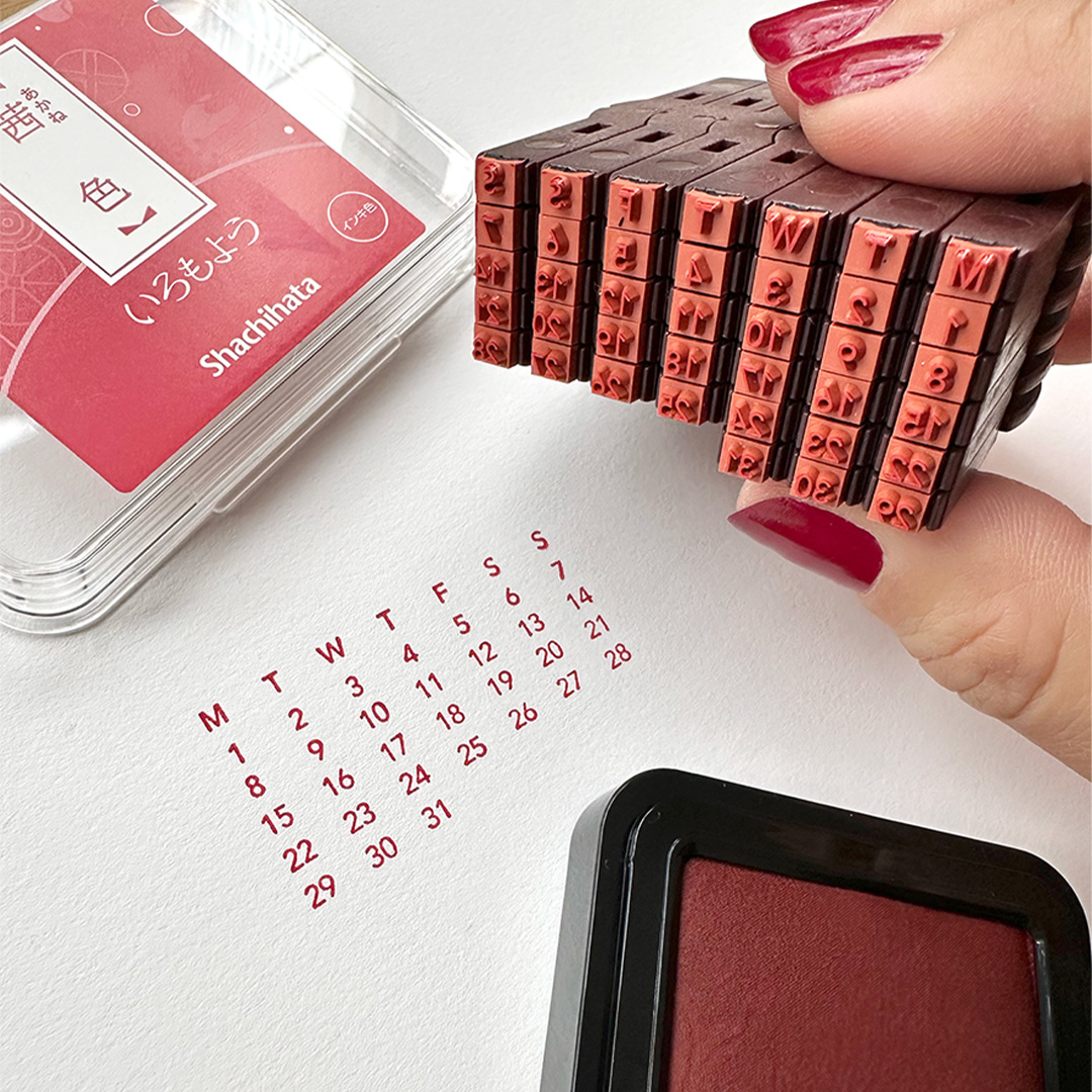 Shachihata Shachi-iro ist ein vielseitiges Kalenderstempelset mit den Zahlen 1–31, den Buchstaben M, T, W, T, F, S, S (für die Wochentage) sowie einigen leeren Feldern. Die Stempel können auseinander genommen, neu angeordnet und sowohl horizontal als auch vertikal wieder verbunden werden, was eine Vielzahl an Kombinationsmöglichkeiten bietet.