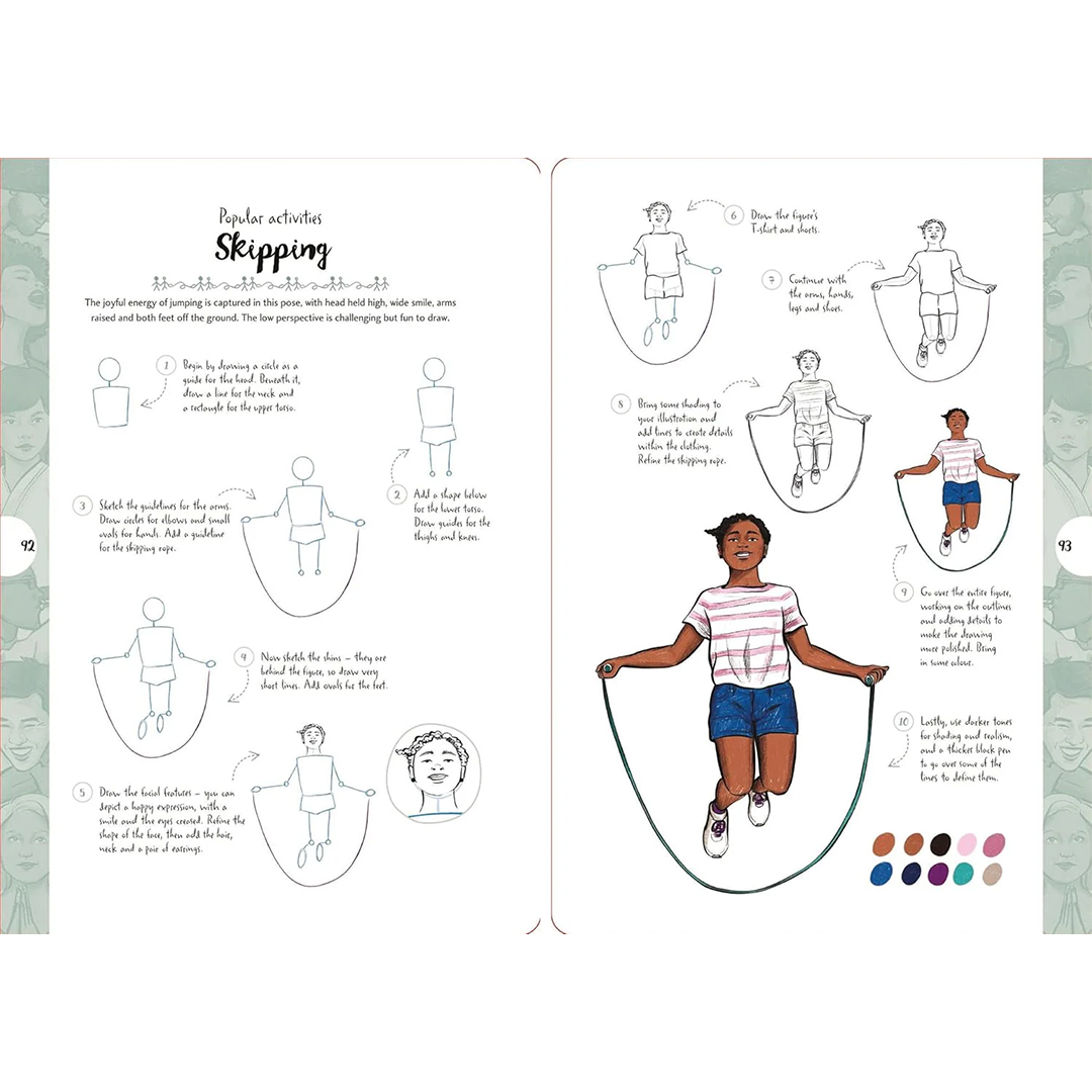 Enthält 50 Figuren mit unterschiedlichem Alter, Körpertyp, Hautton und Geschlecht – jede illustrierte Anleitung ist unterhaltsam und leicht in zehn klaren Schritten nachzuvollziehen.