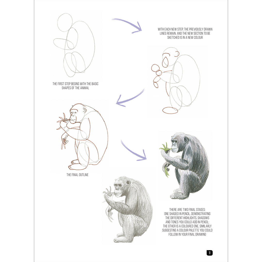 Jedes Tier ist in drei oder vier einfache Schritte unterteilt, die dich mühelos zur fertigen Zeichnung führen. Es gibt keine schriftlichen Anweisungen – nur einfache Formen und Bleistiftstriche. Selbst wenn du noch nie zuvor gezeichnet hast, wirst du erstaunt sein, wie schnell du beeindruckende Ergebnisse erzielen kannst. Jedes Projekt zeigt außerdem zwei fertige Beispiele des Tieres – eines schattiert mit Bleistift und eines in Farbe.