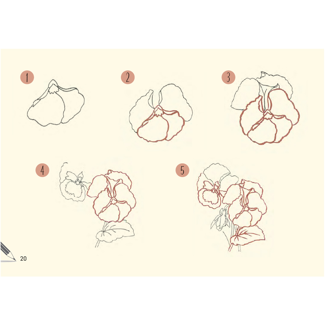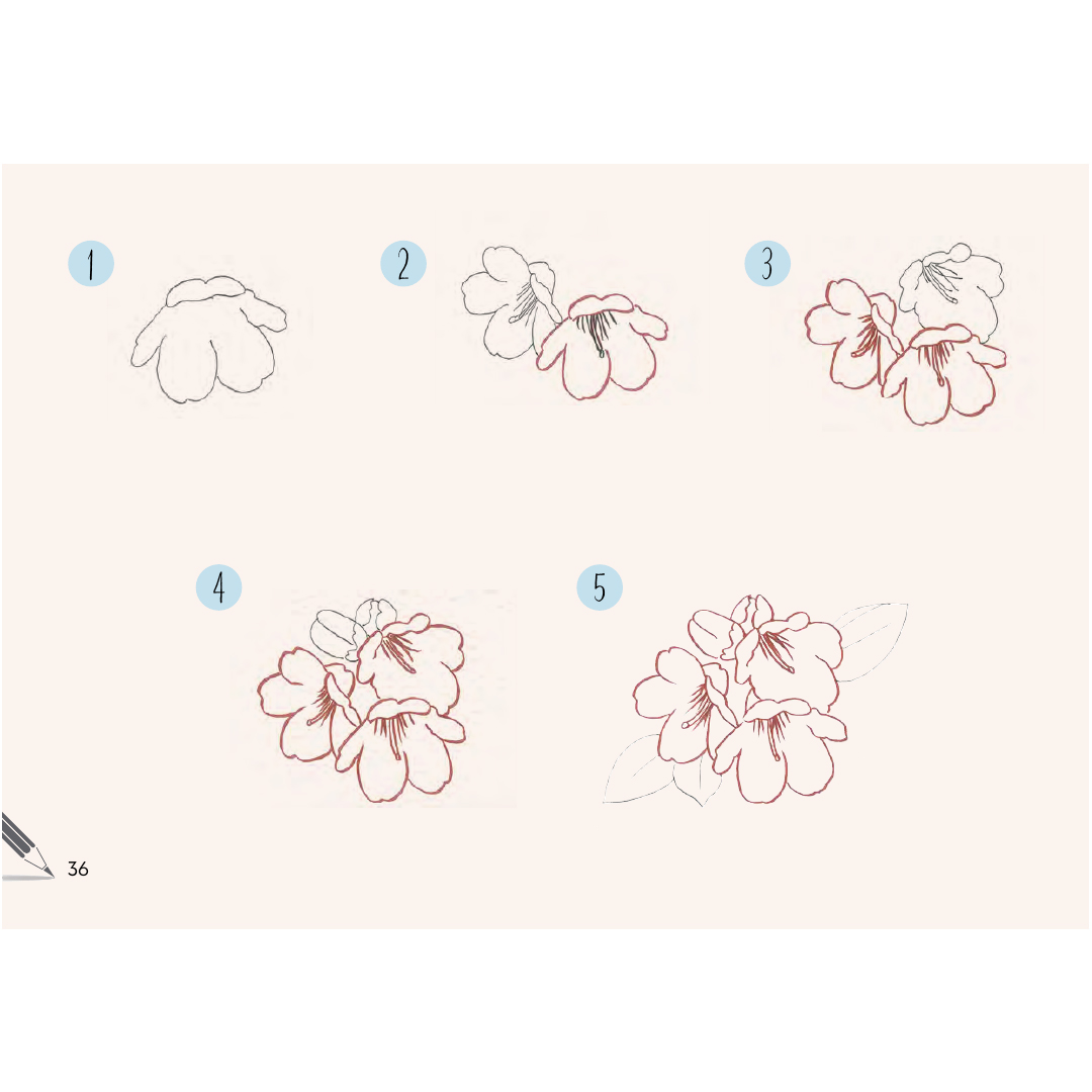 Dank des leicht verständlichen Querformats kannst du sehen, wie die Blumen über die Seiten hinweg erblühen, und sie anschließend selbst auf Papier oder in deinem Skizzenbuch nachzeichnen.