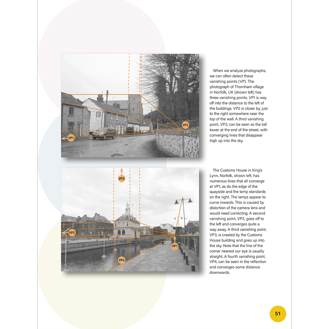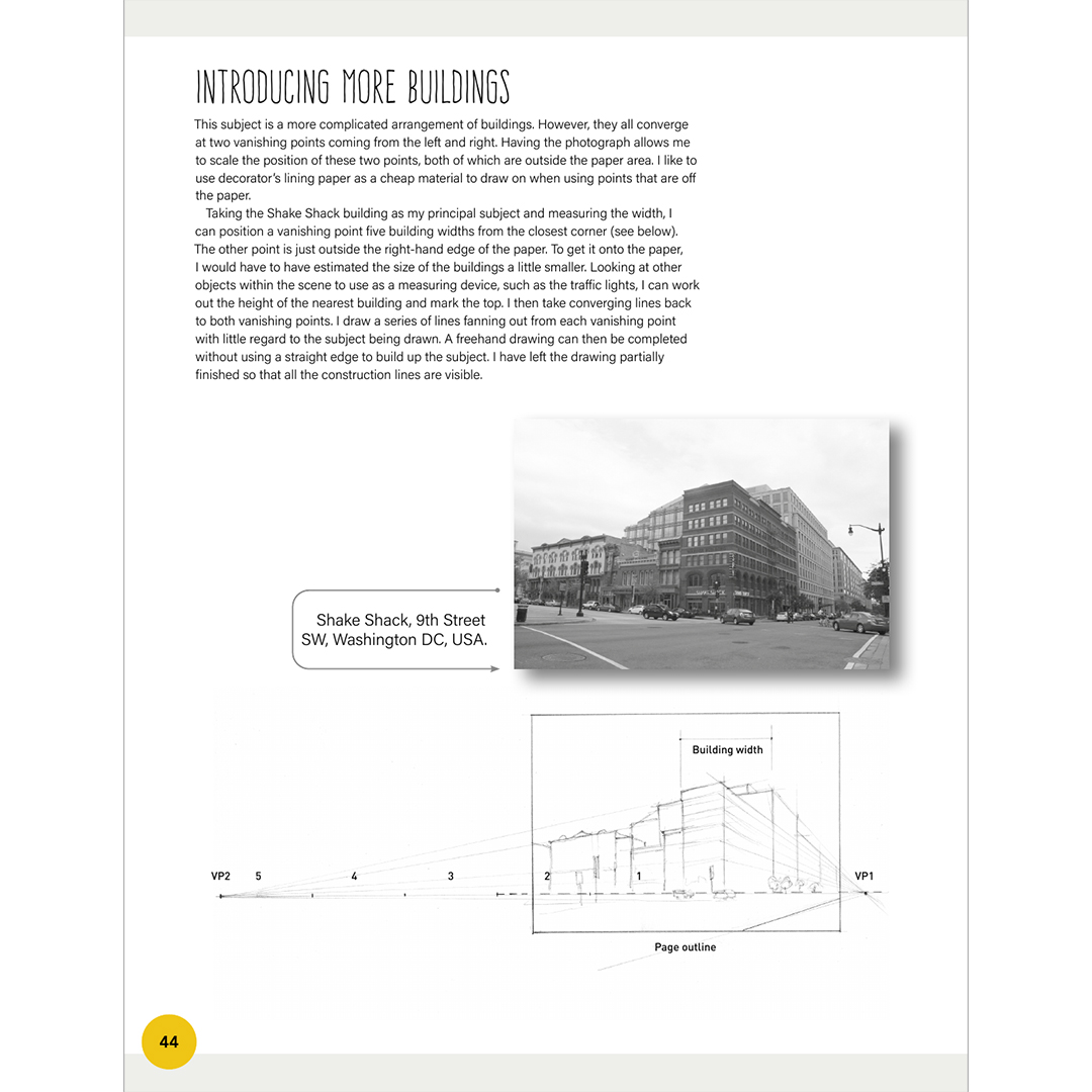 Das Buch enthält zudem Expertenrat zum Zeichnen von gebogenen Objekten und geneigten Flächen, eine Übersicht über häufige Fehler sowie ein inspirierendes Kapitel darüber, wie man über die festen Regeln hinaus frei und intuitiv zeichnen kann.