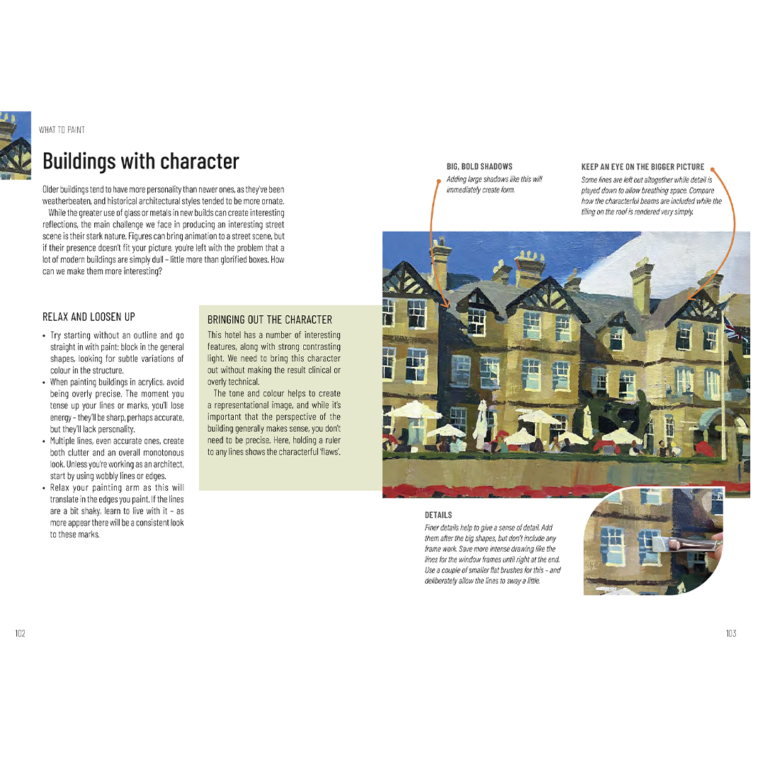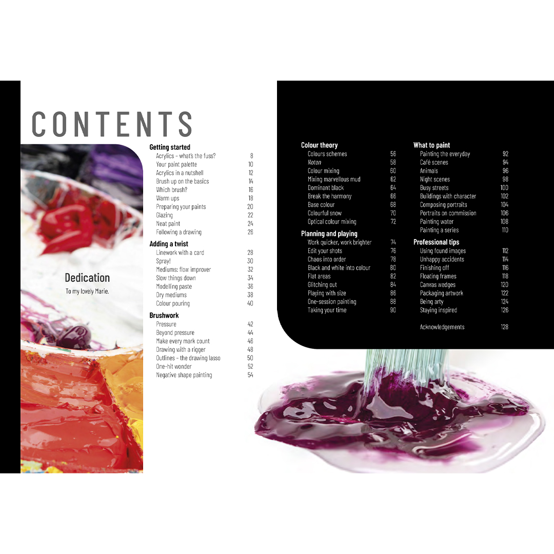 - Erhalte klare, visuelle Anleitungen zur Komposition, zur Farbtheorie und zum Einsatz verschiedener Acrylvarianten, wie etwa flüssig, pastös (heavy body) und andere.