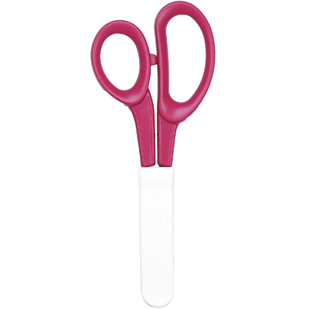 Kinderschere mit Fünffingergriff, abgerundeten Klingen und mitgelieferter Schutzhülle. Eine sichere und gute Wahl für Kinder, die das Schneiden lernen.