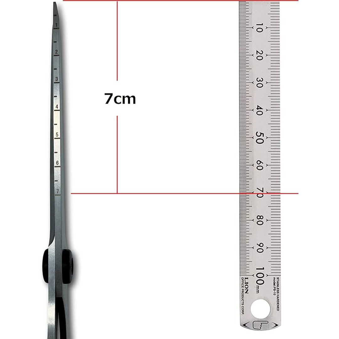 70 mm Lineal auf der Klinge: Diese Schere dient auch zum Messen. Schneiden Sie ohne Lineal bis zu den 70 mm, die auf der Klinge markiert sind, und steigern Sie Ihre Arbeitskapazität.
