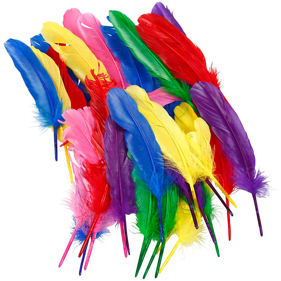 Verpackung mit 36 gefärbten Hühnerfedern in 6 verschiedenen Farben, perfekt für Dekorationen, Masken, Osterbasteln und andere kreative DIY-Projekte. Mit einer Länge von ca. 20 cm sind die Federn ideal groß für Kinder und Erwachsene und leicht zu kleben, zu knüpfen oder auf verschiedenen Materialien zu befestigen.