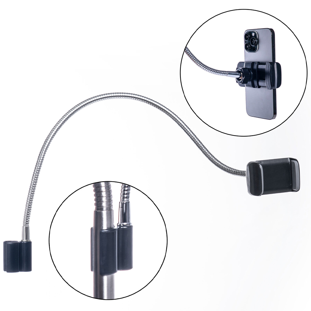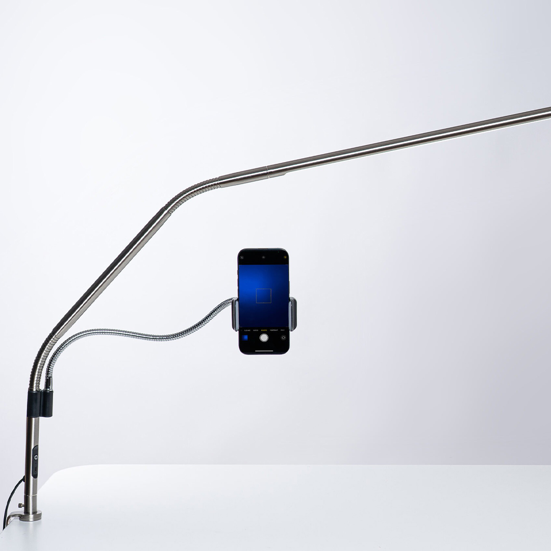 Der verstellbare Arm ermöglicht eine einfache und präzise Positionierung des Telefons, was die Arbeit an kleinen Details oder komplexen Aufgaben erleichtert.