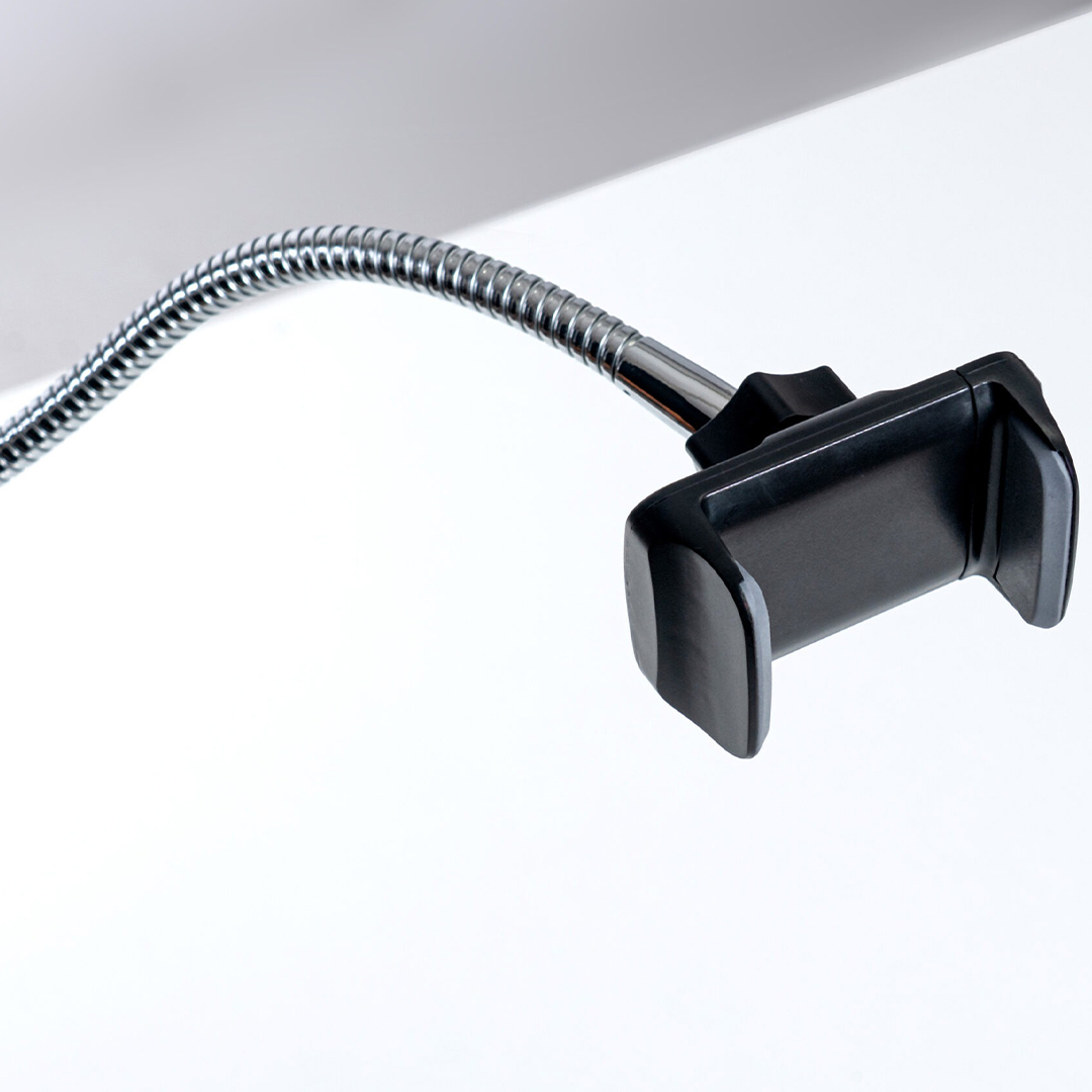 Dank des praktischen Designs lässt sich der Flexi Phone Holder schnell und werkzeuglos am Lampenarm montieren und demontieren.