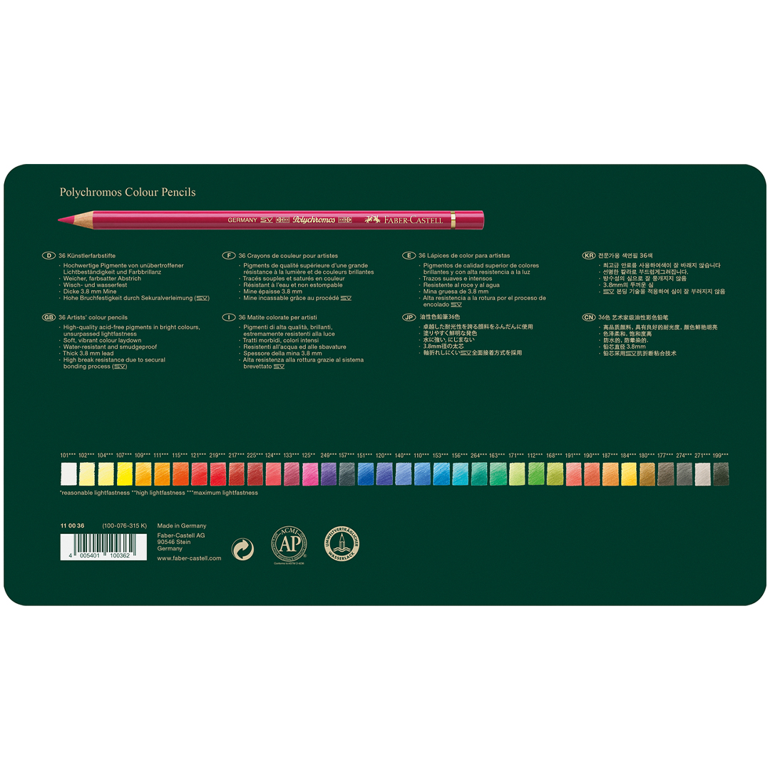 Mit hochwertigen, säurefreien Pigmenten liefern Polychromos eine unschlagbare Lichtbeständigkeit, die die Brillanz der Farben über Jahrzehnte bewahrt, zusammen mit maximaler Bruchfestigkeit, Wisch- und Wasserfestigkeit sowie herausragenden Zeichenqualitäten.