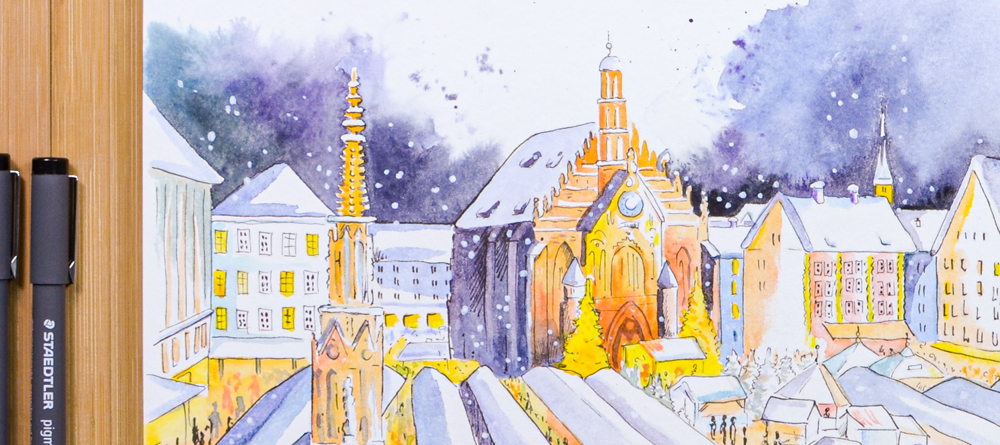 Die meisten denken bei einem Fineliner wahrscheinlich an einen schwarzen Stift – doch das ist ein Irrtum! Schwarz ist zwar die gängigste Farbe, aber viele Marken bieten eine deutlich größere Auswahl an. Die Farbe Ihres Fineliners kann den Ausdruck Ihres Aquarellbildes stark beeinflussen. Schwarze Linien verleihen dem Motiv oft eine klare, grafische Wirkung, während ein grauer oder brauner Stift den Aquarellfarben mehr Raum lässt. Oder warum nicht einmal zu einem roten oder grünen Fineliner greifen? Trauen Sie sich zu experimentieren und probieren Sie verschiedene Farben aus!