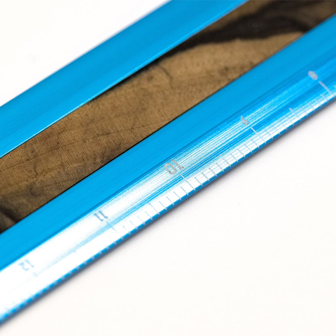 Das Lineal ist wunderschön mit einem seltenen und hochgeschätzten Holz ausgeschmückt, das für seine außergewöhnliche Qualität bekannt ist. Dieses Holz wird häufig für exklusive Möbel, Gitarren und andere Premium-Produkte verwendet, bei denen Aussehen und Haltbarkeit entscheidend sind. Die Kombination aus robustem Aluminium und exklusivem Holz verleiht dem Lineal eine einzigartige Eleganz.