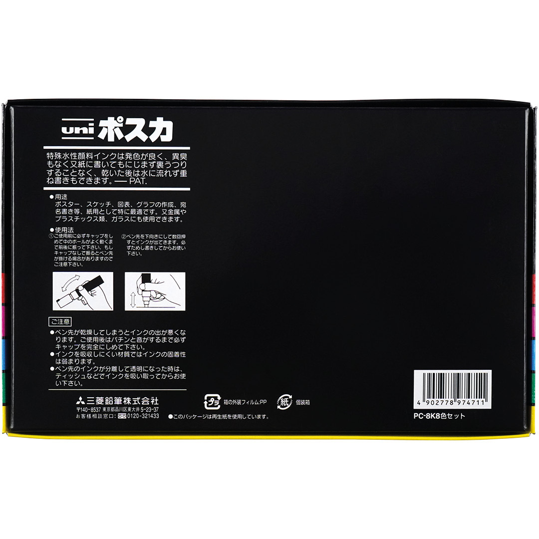 Uni Posca ist ein wasserbasierter deckender Farbstift mit Pigmenten, die auf vielen verschiedenen Oberflächen haften wie Papier, Karton, Holz, Stein, Textil, Glas, Plastik und Metall. Die Farbe ist auf vielen porösen Untergründen permanent und kann von glatten Oberflächen entfernt werden, was Experimentieren ohne Beschädigung des Untergrunds ermöglicht. Die Farbe trocknet schnell, ist geruchlos und eignet sich ebenso für spontane Bastelprojekte wie für anspruchsvollere künstlerische Arbeiten.
