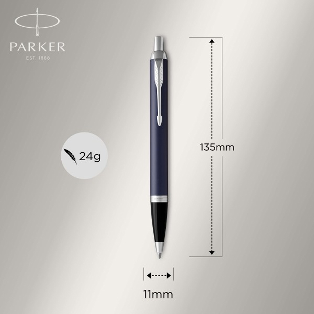 Parker IM Kugelschreiber mit schwarz lackiertem Gehäuse und Chromdetails. Angenehmes Gewicht und elegantes Design. Erscheint in einer schlichten Geschenkbox. Blaue Tintenpatrone. Nachfüllbar mit Kugelschreiberminen von Parker.