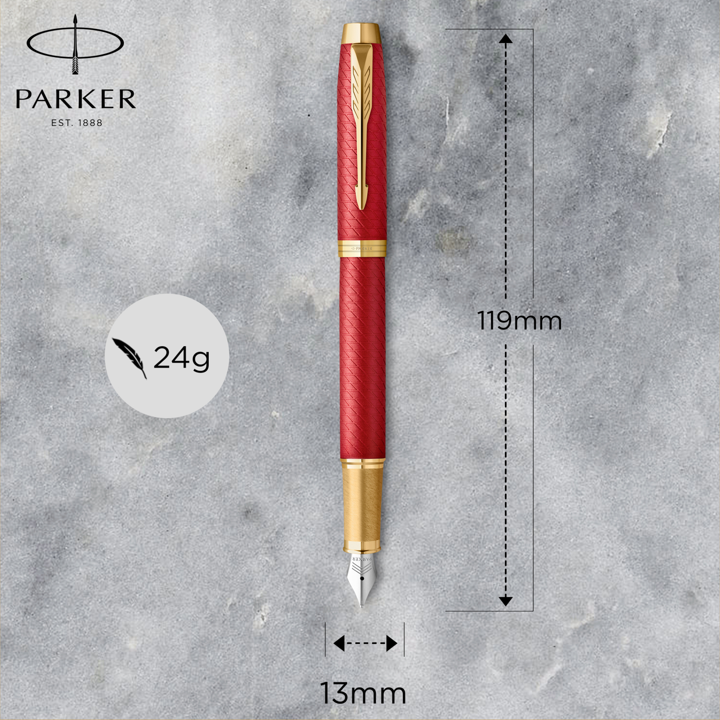 Mattrote Lackierung mit eingraviertem rautenförmigem Muster und vergoldeten Details. Nachfüllbar mit Original-Patronen von Parker für Füllfederhalter oder Konverter. Erscheint in einer schlichten Geschenkbox inklusive einer enthaltenen Patrone. Diese Version ist auch als Tintenroller und Füllfederhalter erhältlich.