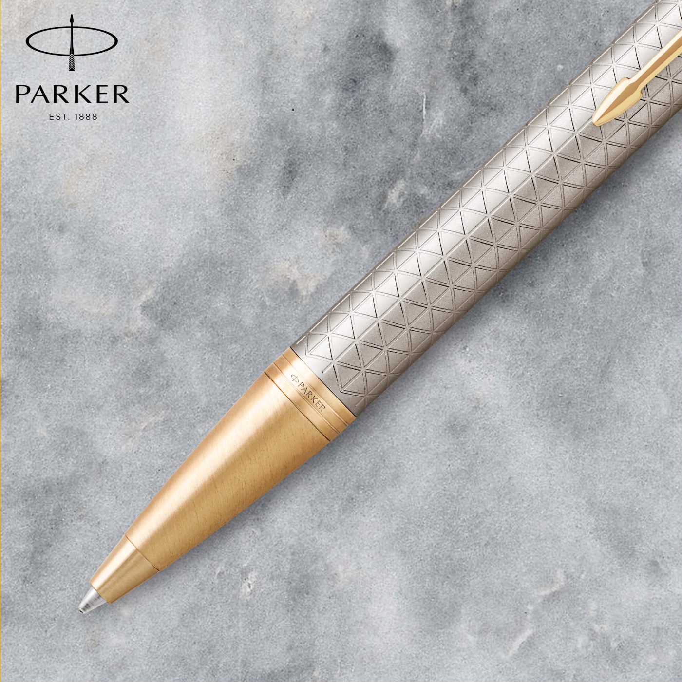 Schimmernde Silberlackschicht mit eingraviertem rautenförmigem Muster und vergoldeten Details. Nachfüllbar mit den Kugelschreiberminen von Parker. Erscheint in einer schlichten Geschenkbox inklusive einer enthaltenen Patrone. Diese Version ist auch als Tintenroller und Füllfederhalter erhältlich.