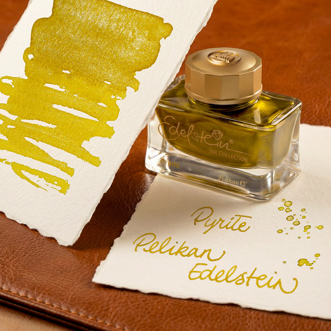 Edelstein Ink of the Year 2026, Pyrite, präsentiert einen weichen, hellgoldenen Farbton, angereichert mit schimmernden Partikeln, die dem Edelstein-Sortiment einen wahrhaft goldenen Glanz verleihen. Perfekt für Kalligraphie, Journaling und kreatives Lettering – dieses schimmernde Tinte verleiht dem Schreiben visuelle Eleganz und emotionale Tiefe.
