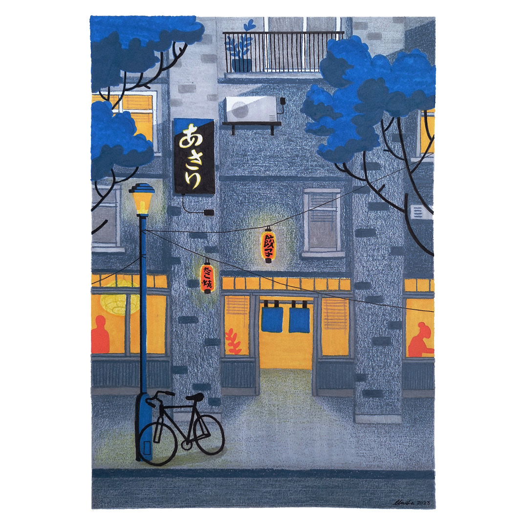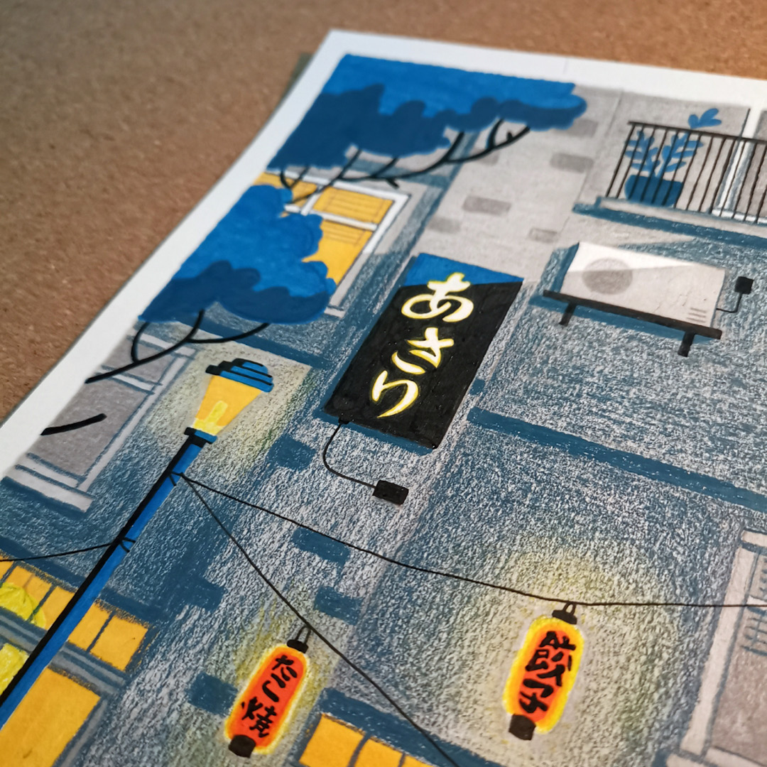 Das Motiv wurde stark von den Stiften selbst inspiriert. Die dunkelblauen Töne in Kombination mit kräftigem Gelb und Orange erinnerten mich an einen Abend in lebhaften Stadtstraßen. Ich wollte das Leben an einem dunklen Abend darstellen. Gleichzeitig sollten die Farben und Texturen der Stifte deutlich zur Geltung kommen. Deshalb entschied ich mich für eine eher flache Komposition, bei der die Perspektive nicht von den Farben und der Textur des Werkes ablenkt.