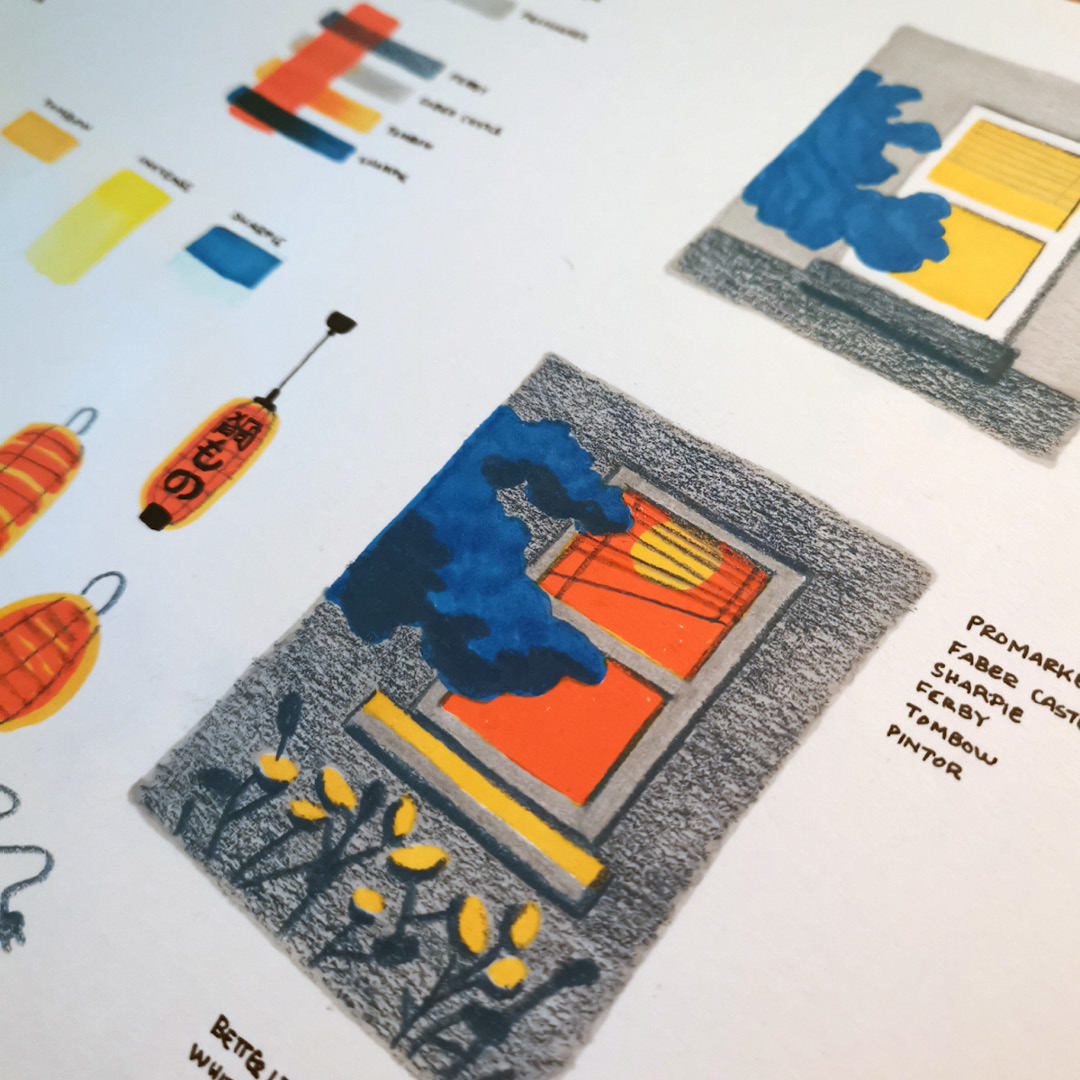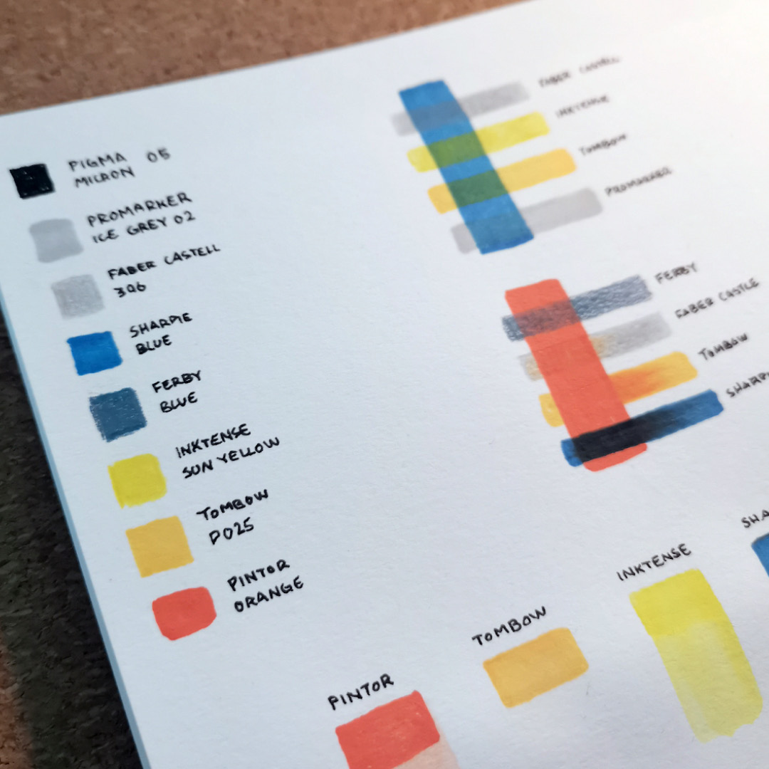Einige der Stifte kannte ich bereits, die meisten waren jedoch neu für mich. Sobald ich sie erhalten hatte, begann ich, Farbkarten mit den verschiedenen Farben zu erstellen. Ich probierte unterschiedliche Kombinationen aus und legte mehrere Farben übereinander. Nachdem ich die Stifte besser kennengelernt hatte, begann ich zu entscheiden, was ich zeichnen wollte.