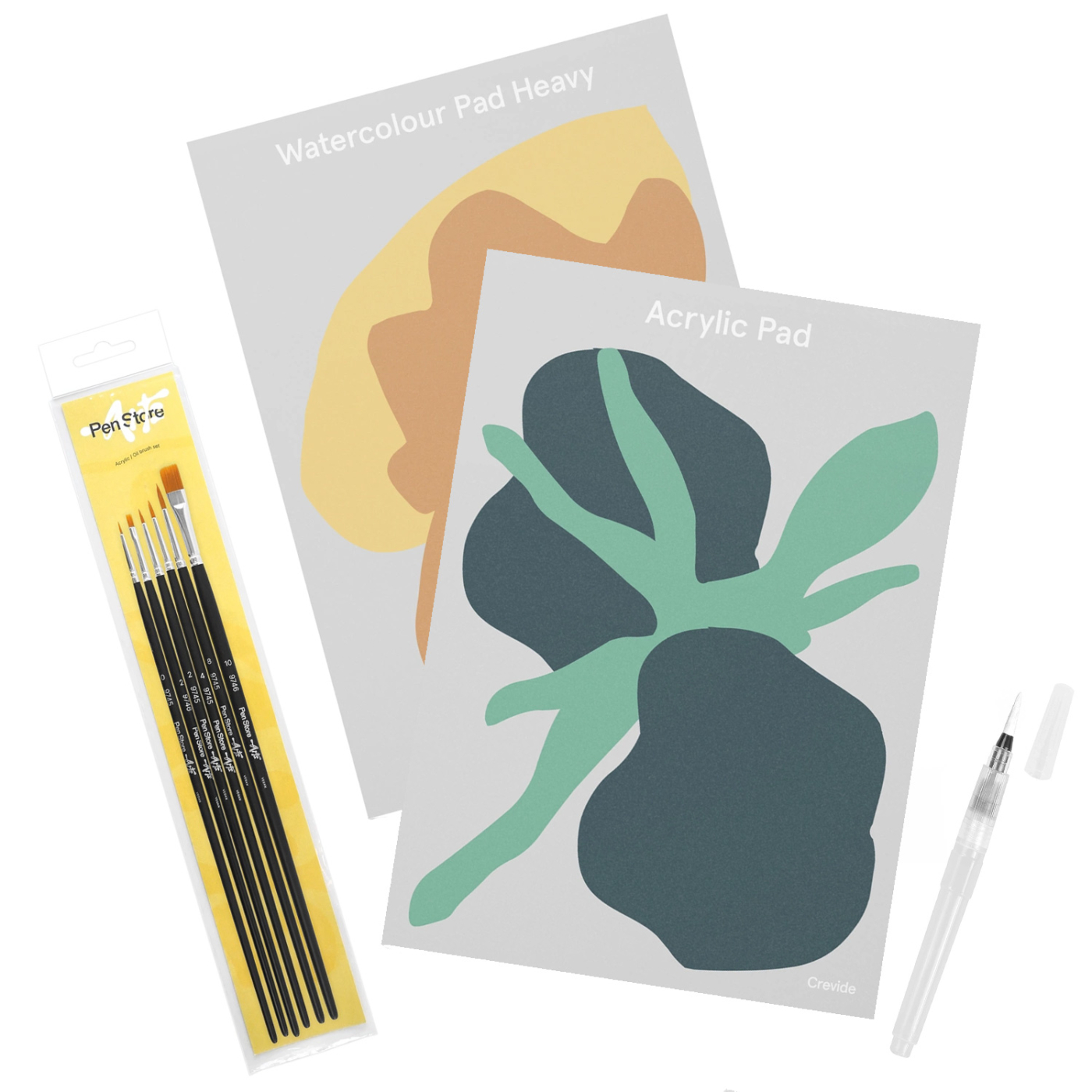 Dieses Add-on „Creativity Booster“ enthält zwei A4-Blöcke, ein 6er-Set synthetischer Pinsel sowie einen nachfüllbaren Wasserpinsel.