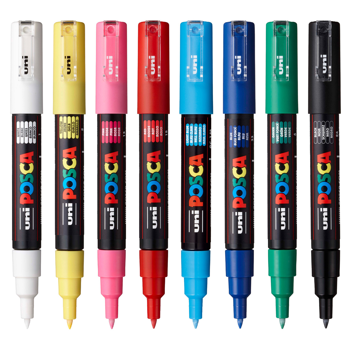 Das Set enthält 8 Stück Posca PC-1MC. Farben: Black, Green, Light Blue, Blue, Red, Pink, Yellow, White.