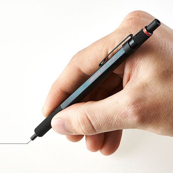 Rotring 500 Druckbleistift. Schwarzes sechskantiges Kunststoffgehäuse mit abnehmbarem Metallclip. Radergummi oben. Zylindrischer Metallgriff mit Rille. Durch Drehen des oberen Stiftteils kannst du dessen Härtegrad anpassen.