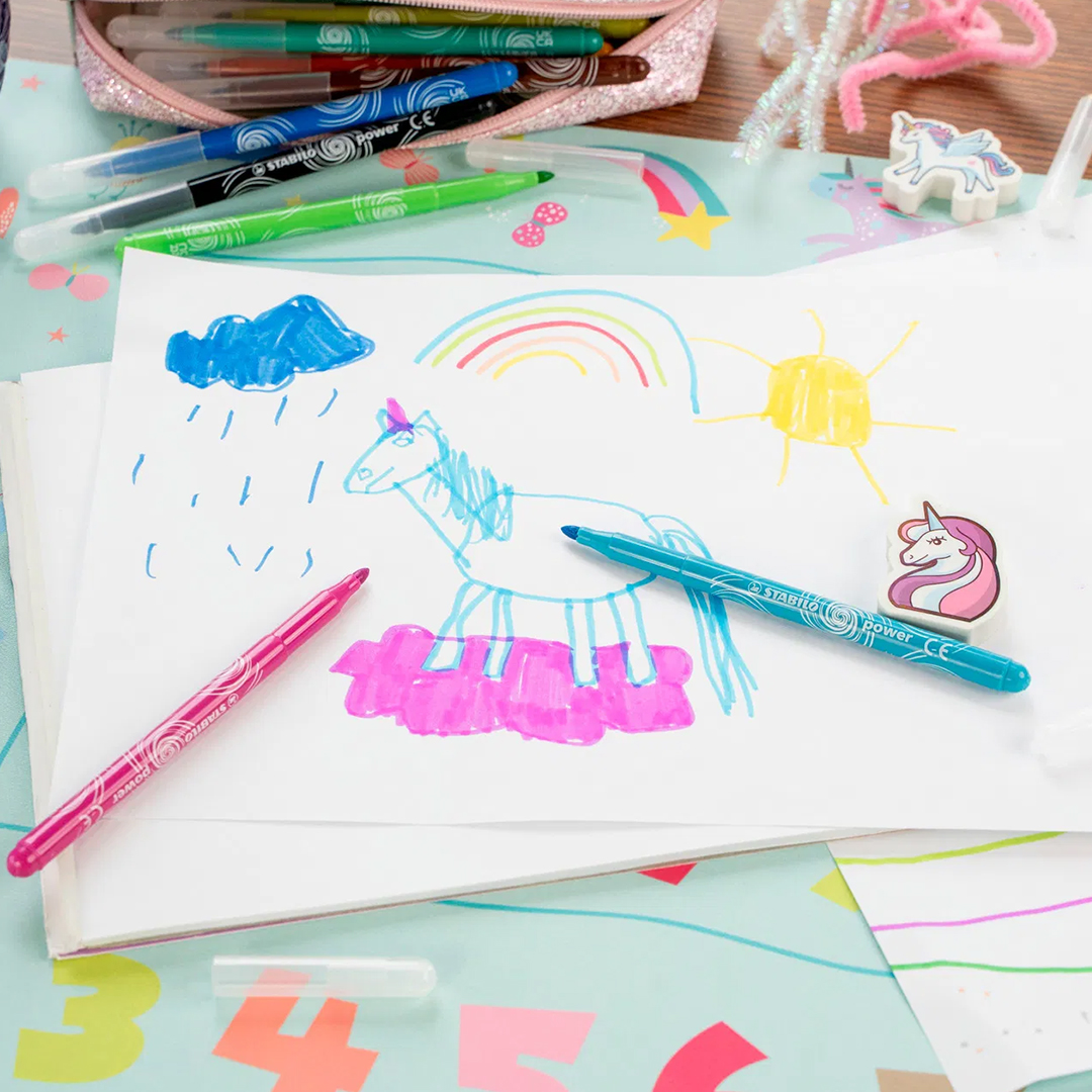 Power kann bis zu 8 Wochen ohne Kappe liegen, was eine rekordlange „Cap-off“-Zeit ist. Die Spitze ist robust und dafür ausgelegt, auch starkem Druck standzuhalten, wenn der kleine Künstler besonders intensiv malt.