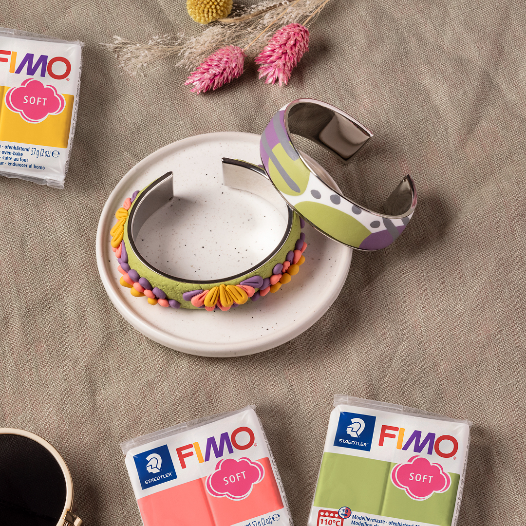 Es gibt FIMO Soft 8020 g in 30 klaren Farben, die sich leicht zum gewünschten Farbton mischen lassen. Die Modelliermasse wird im Ofen bei 110 Grad Celsius für 30 Minuten gehärtet.