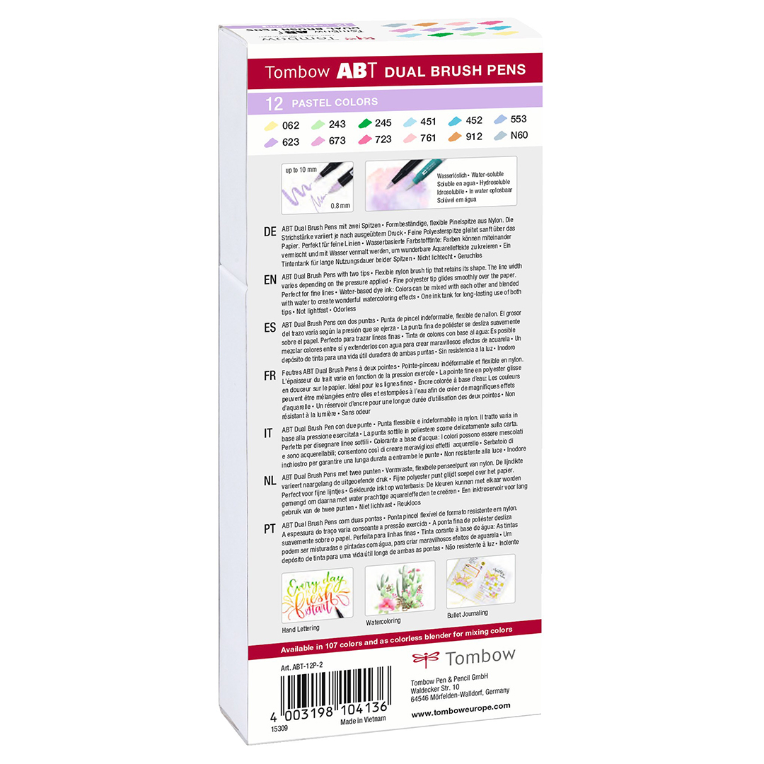 Das Set enthält 12 x ABT Dual Brush Pens:N60 cool grey6, 062 pale yellow, 243 mint, 245 sap green, 451 sky blue, 452 process blue, 553 mist purple, 623 purple sage, 673 orchid, 723 pink, 761 carnation, 912 pale cherry.