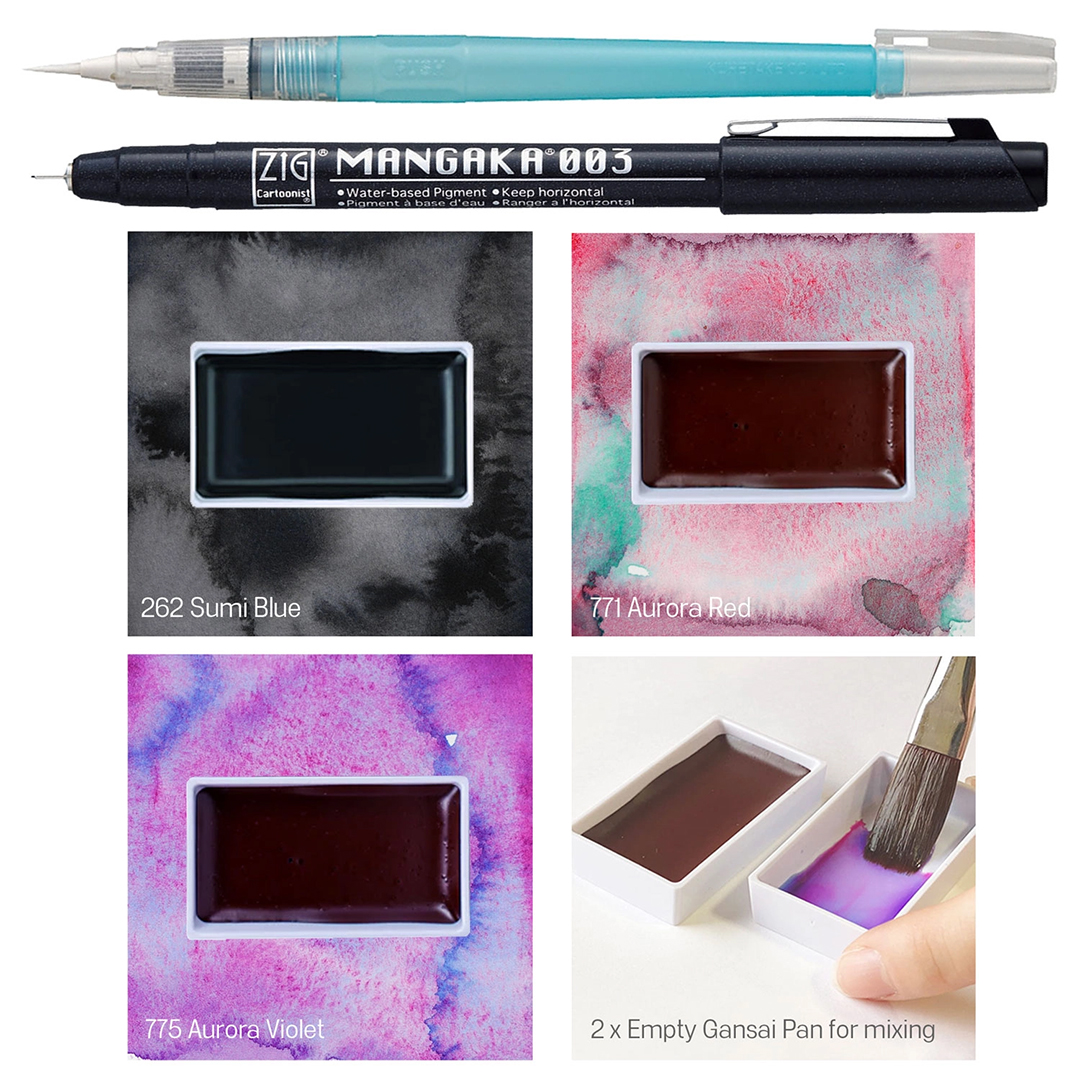 - 2 Gansai Tambi Granulierende Farben: Aurora Red (771) / Aurora Violet (775)